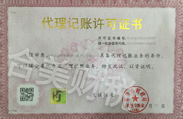 合美共創財稅顧問(東莞)有限公司(簡稱:合美財稅)成立于2018年,是經東莞市市場監督管理局、東莞市財政局批準的,具備《營業執照》、《代理記賬許可證》的合法、正規的企業;現有設立東莞、廣州、深圳、香港等地的公司。